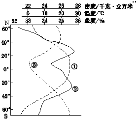 (3)海洋表层盐度的分布规律:从南北半球的副热带海区分别向两侧的高纬度和低纬度递减,所以盐度最高的为①,位于副热带海区。海水表层温度的分布规律是从低纬向高纬递减,③纬度最高,盐水纬度最低。