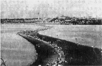 2013年世界园艺博览会于5月-10月在辽宁锦州举办。锦州著名的风景区是笔架山风景区。如下图所示,景区以笔架山岛和天桥为主,它神奇之处是山岛与海岸有一条神桥——“天桥”(长1620米的砂石路)。传说是天上仙女所造,这座天桥时隐时现,隐可驰舟,现可行人,每天“天桥”露出水面两次,这一现象属世界奇观,天下一绝。