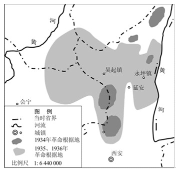 小题1:描述1934年至1936年革命根据地分布范围变化的特点。