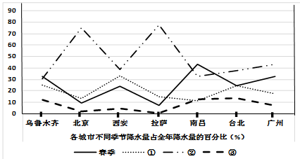 3、单选题 下图是我国主要城市不同季节降水相对值折线图,据此回答下列各题。