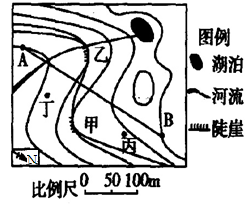 5、单选题 下图示意某小区域地形。图中等高距为100米,瀑布的落差为72米,完成下列各题。