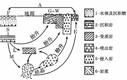 (1)图中字母表示的地理含义是:A:?、E:?、G:风化作用、L:、?F:、?、S:固结成岩作用、W:?、M:?。
