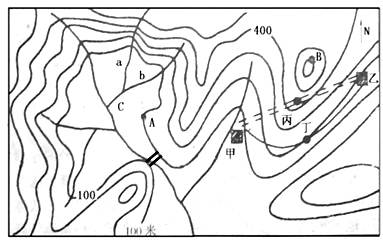 (1)c地区为?地形区,理由有?。 (2)A地气温为25℃,则B地的气温约为?℃。 (3)a、b两支流,水流较缓的是??,原因是??。 (4)在图中河流上拟建以水电站,请用“=”标出最佳坝址,理由? ??。 (5)计划在甲、乙两村之间修一条公路,经过?(丙处还是丁处)比较合理,原因是? ?。