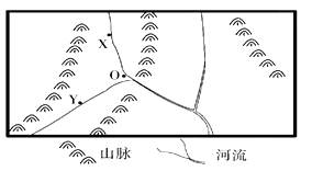 3、单选题 下图为某地理学习小组所绘的“25°N附近某小区域示意图”,为正确标注该图的指向标,同学们测得O城6月7日日出、日落分别在X、Y方向,读图完成下题。