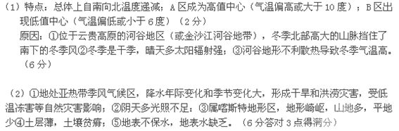本题解析:本题考查我国的区域地理。(1)直接根据图示的等温线分析判断,主要描述递变方向和主要的极值中心分布。结合地理位置判断A位于我国云贵高原,影响冬季气温主要从地形对冬季风的阻挡分析,和昆明准静止锋的位置分析。(2)B地区位于贵阳,属于云贵高原,影响农业生产的自然条件主要从气候、地形、土壤、水源和生态环境等方面分析,主要判断不利条件。