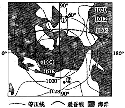 4、单选题 下图示意某区域某时刻海平面等压线分布,图中虚线为晨昏线。读图完成1—2题。