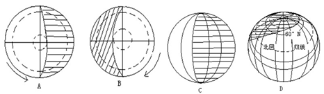 本题解析:根据图示的自转方向和昼夜半球的分布判断,A图自转方向显示地球自转方向为逆时针,判断图示为北半球,北极圈内出现极昼,故判断为北半球夏至日;B图自转方向为顺时针,判断图示为南半球,南极圈内出现极昼,判断为北半球冬至日;C图晨昏线与经线重合,即判断为春分日或秋分日。D图图示晨昏线与北极圈相切,北极圈内出现极夜,故判断为北半球冬至日。 点评:试题比较单薄,只是考查晨昏线图的判断,符合会考要求,解题的关键是掌握二分二至日,晨昏线的分布特征即可判断。
