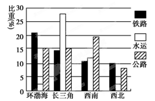 3、单选题 读“我国长三角、环渤海、西北地区和西南地区三种货运方式占全国的比重(%)示意图”。完成以下问题。