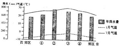 1.该城市市区年降水量大于郊区的原因是2.图中①、②、③、④四地中,最可能表示重化工业区的是