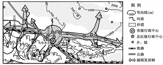 5、单选题 下图是以乌鲁木齐为中心的城镇带规划示意图。读图回答问题。