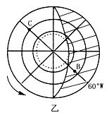 3、综合题 地球的平均半径为6371千米。甲图中阴影部分为黑夜,乙图是甲图的极点俯视图。此时北京时间为9时。读图,回答问题。(12分)