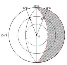 A.一直往东北方向 B.一直向西南方向 C.先向东南再向东北 D.先向西南再向西北 参考答案: 本题解析: 本题难度:一般 3、单选题 一天,我国某城市于北京时间4时30分日出,18时30分日落,该城市的经度为 参考答案:C 本题解析:根据当地的日出日落时间计算当地昼长14小时,即上午7个小时,故当地的正午为北京时间的11:30分,当地为正午12时,故判断当地时间较北京时间早半个小时,故当地位于120°E的东侧7.5°。 本题难度:困难 4、单选题 北京时间2010年10月1日18时59分,我国自主研发的探月卫星“嫦娥二号” 在西昌卫星发射中心发射升空,目前已成功飞入预定轨道。据此回答: 参考答案:C 本题解析: 本题难度:简单 5、单选题 当北京时间为12点时,一年中晨线与北半球某纬线的交点运动轨迹如下图所示,A点经度为39°E。读图完成下列问题。 |