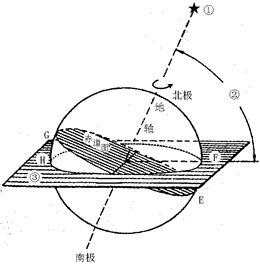 (1)角②的度数是?,平面③的名称是?。 (2)当太阳直射点在F点时,可能的日期是?;当太阳直射点在H点时,可能的日期是?。 A.3月21日前后? B.6月22日前后? C.9月23日前后? D.12月22日前后 (3)当太阳直射点由E移至F的过程中,下列说法中正确的有?。 A.北半球各地正午太阳高度角逐渐增大 B.北半球各地昼渐长夜渐短 C.南半球各地正午太阳高度角逐渐减小 D.北半球各地昼渐短夜渐长 (4)当太阳直射点由G移至H的过程中,下列现象中可能出现的有?。 A.地中海沿岸逐渐进入多雨季节 B.澳大利亚热带草原由干季转为湿季 C.南半球温带草原开始进入冬季 D.海河开始进入汛期 (5)若黄赤交角为20°,下列现象正确的是?。 A.直射点回归运动的周期缩短 B.北纬20°纬线成为北回归线 C.直射点在南北纬20°之间作回归运动 D.直射点在单位面积内获得的太阳辐射能减少