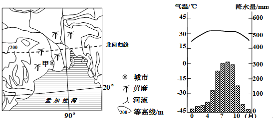 下面左图中甲城市为世界最大的麻纺工业中心,也是该地区联系河运和海运的重要港口。下面右图为甲城市的气候资料。
