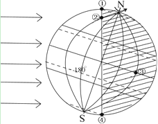 ⑵这一天,①②③④四点中,昼夜等长的是 点,处于极夜的是 点,