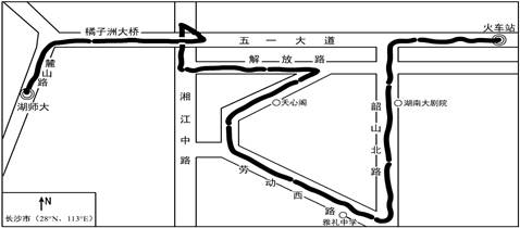 【小题1】乘车时在正午附近,此时太阳位于南方,坐在车子的右侧,所以在天心阁的位置,可能晒到太阳。