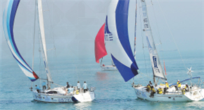 2011年3月21日,“中粮亚龙湾杯”环海南岛国际大帆船赛今天展开了第一分赛段海口-- 洋浦赛段的角逐。图为参赛帆船“启航号”“三力星号”在比赛中。