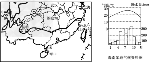 我国部分地区等温线分布图和海南岛某地气候资料图。