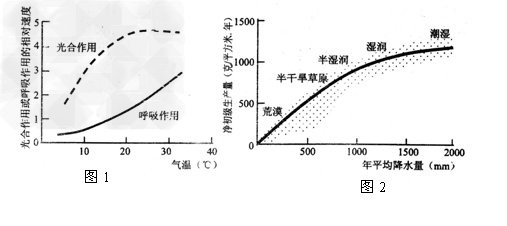 净初级生产量指在初级生产过程中,植物光合作用固定的能量中扣除植物呼吸作用消耗掉的那部分能量。图1为光合作用、呼吸作用随气温变化图,图2为净初级生产量随雨量变化图。读图完成1~2题。