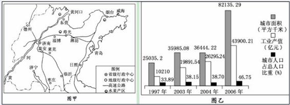 ⑵从图乙中可以看出山东省城市化快速推进主要表现在 、 两个方面。(2分)