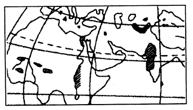 1、多选题 下图中的阴影部分,是亚欧非地区某种主要经济作物的种植区。阴影区域种植该经济作物的共同条件是
