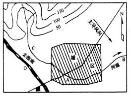 (2)A地建设化工基地的有利区位条件可从交通、原料、付租能力及对城区环境的影响等方面分析。A地有盐田,原料丰富;化工厂污染大气污染河流,而A地位于与季风垂直的郊外,位于河流下游,对城市污染少;工业付租能力较低,对交通条件要求较高,而A地远离城区,地价较低,又靠近河流,交通便利。