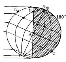 (2)图中AD两地均位于晨昏线中的 线上,A地日落时刻是 点钟,昼长 (小时)。D地日落时刻是 点钟。A地的正午太阳高度是 。该日过后,太阳直射点向 (南或北)移动,此时,北半球昼夜长短的状况是___ ______。