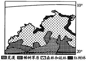 【小题3】红树林主要分布在南北纬25°之间的沿海滩涂,生活在低纬的热带、亚热带浅海地带;与土壤、地形因素无关;适应盐碱的海水,与降水因素无关;能在其它纬度分布,可能是洋流因素,暖流流经增温增湿,使较高纬度可生长红树林。选C正确。