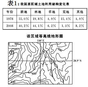 4、单选题 读我国某区域土地利用结构变化表(表1)和该区域等高线地形图,回答下列问题。