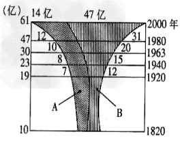 材料二:2000、2050中国人口年龄性别结构图,2000年(阴影)、2050年(空白)