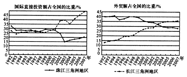 参考答案:(1)大于;小于 (2)上升;下降 (3)20世纪90年代以来,随着我国对外开放范围的逐步扩大,与长江三角洲相比,珠江三角洲地区的产业基础、科技实力和人才队伍都处于劣势。同时,外商投资区位的选择也由原来追求降低成本转变为扩大市场而迁往长江三角洲或国内的其他地区,故而导致近年来长江三角洲地区的国际直接投资和进出口贸易总额呈较明显的上升趋势。