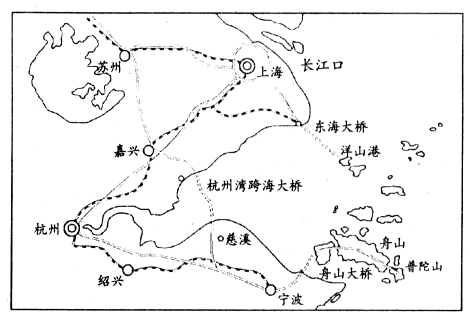 2011年7月7日,国务院正式批准设立浙江舟山群岛新区。舟山群岛新区将建成中国大宗商品储运中转加工交易中心、东部地区重要的海上开放门户、中国海洋海岛科学保护开发示范区、中国重要的现代海洋产业基地、中国陆海统筹发展先行区。下图为舟山群岛新区及周边区域示意图。