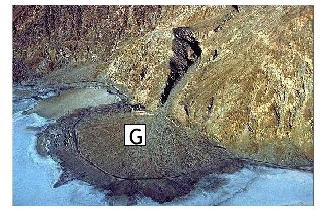 小题1:由图可知,G位于河流出山口处。河流流出山口处,流速减缓,其携带的大量碎石和泥沙在山前堆积,形成冲积扇;冰斗分布在高山和高纬度地区,是由冰川侵蚀作用形成的;三角洲位于河流入海口处,是由流水沉积作用形成的;沙丘位于干旱的内陆地区,是由风力的沉积作用形成的。