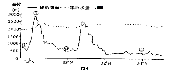 4、单选题 图4是“沿106.5°E经线的地形剖面及相关气候资料图”,据图回答1.-3题。