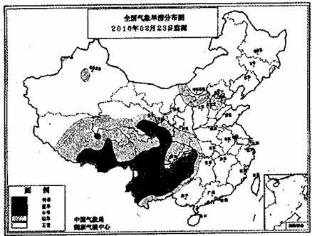 材料二:2010年2月23日国家气候中心发布的全国气象旱涝分布图。