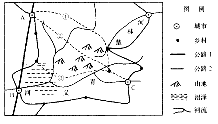 (1)该地区A、B两城市之间建有两条公路,分别是国道和地方性道路。根据公路建设一般原则判断:公路1是__________。