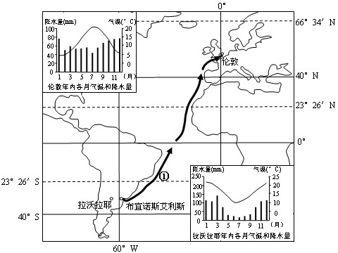 (3)据图可知:拉沃拉耶的气候为亚热带季风性湿润气候,伦敦为温带海洋性气候,伦敦相对于拉沃拉耶的气候气候特点年均温较低(冬季气温均较低),降水季节分配较均匀,原因是纬度较高;全年受来自海洋的西风和暖流的影响。
