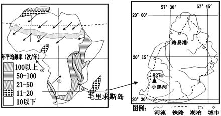 (1)图中①②③④中能代表“魔风”的数码是?,并说明原因。(3分) (2)毛里求斯岛上铁路和城市布局的特点及原因.(4分) (3)描述非洲地震空间分布特征,并说明理由。(4分) (4)结合材料二和材料三,说明野生动物迁徙过程中长时间停留在塞伦盖蒂的原因。(3分) 参考答案: 本题解析: 本题难度:一般 4、单选题 读世界某区域图,回答下列各题。 |