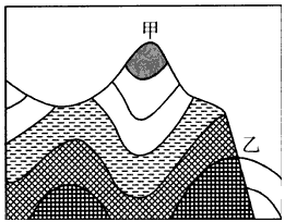 D、甲处岩体受挤压,不易被侵蚀而成山