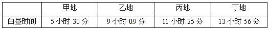 3、单选题 下表中所列的是6月22日甲、乙、丙、丁四地的白昼时间,根据表中数据回答1—3题。