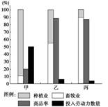 小题3:丙地区种植业比重很小,以畜牧业为主,商品率高,而且劳动力投入少,最可能是大牧场放牧业。建设高质量的人工草场,提高牧草质量是提高土地载畜量的合理措施。