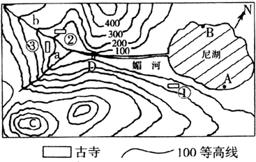 (1)根据图中指向标和尼湖的位置可知,位于尼湖之南的古寺是①。