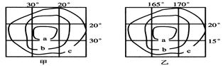 A.甲图全部在西半球,乙图在北半球 B.甲图比例尺较乙图大 C.甲图实际范围比乙图大 D.甲图实际坡度较乙图大