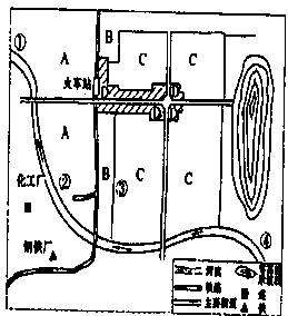5、综合题 读右图为“某城市简图”,当地夏半年盛行东南风,冬半年盛行东北风,回答问题(15分)