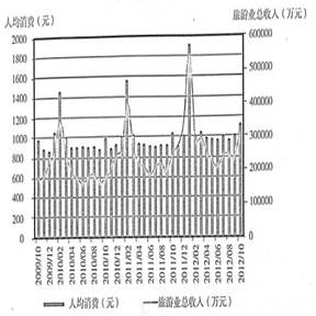 读2009年10月-2012年10月昆明旅游人均消费和旅游业总收入图,回答问题。