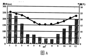 2、综合题 阅读图文材料,结合所学知识回答下列问题。(14分) 材料一 图A为“巴西东南沿海某城市气温曲线和降水柱状图”。