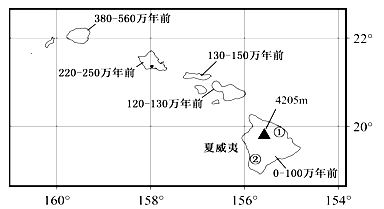 【小题1】根据材料,夏威夷群岛是由一个固定不动的岩浆上涌通道所形成的火山喷发而成。根据图中岩层年代判断,离火山通道近的形成晚,远的年代早。说明岩层形成后自东南→西北方向移动,D对。