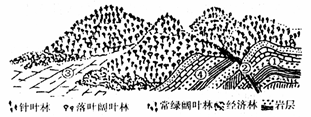 小题2:树种繁多,是指有亚热带、温带和亚寒带的树种,这是由于图示地区海拔高,热量条件由山麓向山顶不断减少造成的。正确答案选B。