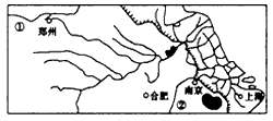 (1)图中①②所代表的河流分别是_________、_________。据图描述淮河的水系特征:______________