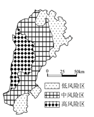 (1)读图,根据图例分析,该地中西部风险较高,东南部、东北部风险较低。